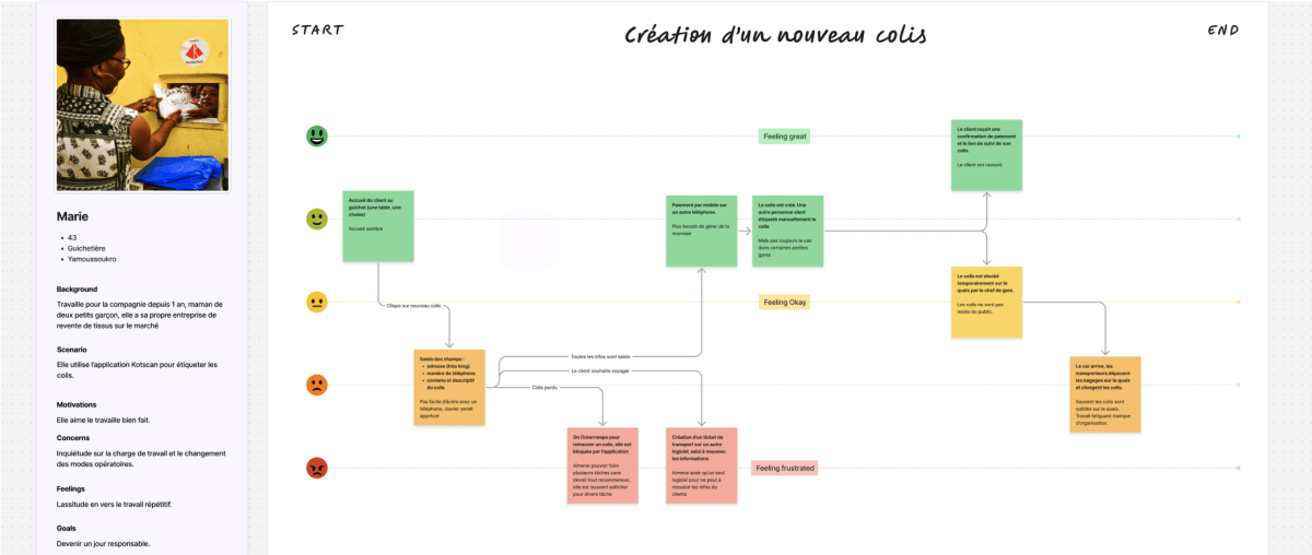 En me basant sur mes recherches, j’ai pu cartographier les différentes actions réalisées par les guichetières et visualiser les points de blocage (Customer Journey Map). Ce travail a constitué une base solide pour optimiser le parcours utilisateur.