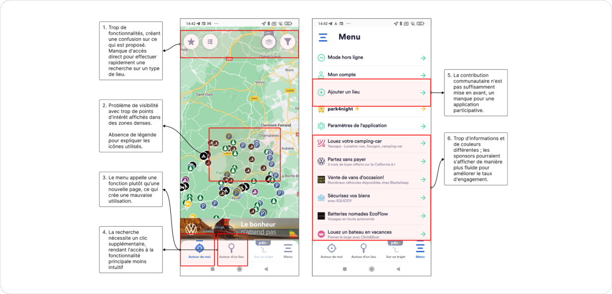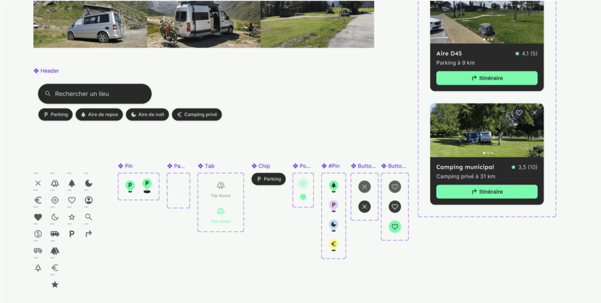J’ai réalisé une étude de cas sur l’application Parking4Night, que j’utilise souvent en roadtrip. J’ai repéré des soucis d’ergonomie, comme une surcharge d’informations et des fonctionnalités difficiles d’accès. En repensant l’interface sur Figma, je l’ai rendue plus simple, intuitive et visuellement plus attrayante.