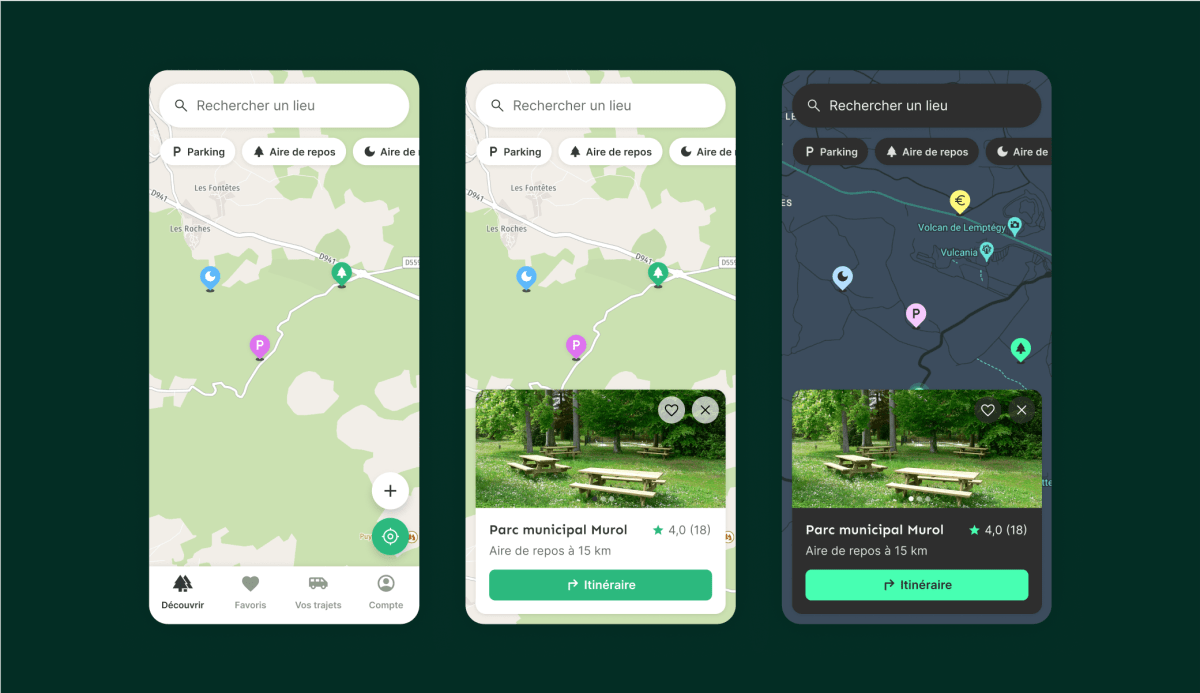J’ai créé un prototype sur Figma avec une interface épurée qui permet aux utilisateurs d’identifier rapidement un point d’intérêt et de naviguer facilement vers celui-ci. J’ai repris les couleurs de l’identité visuelle de l’entreprise et ajouté une version sombre pour un meilleur confort d’utilisation la nuit.